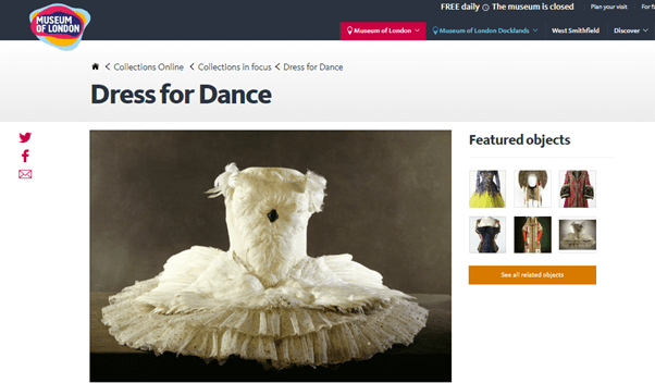 The website also has a dedicated ‘Dress for Dance’ page from which you can browse the related objects, but I have found searching in the main Collections Online page more effective (especially if you are looking for the extensive Anna Pavlova collection – for this simply search Anna Pavlova and you we see 100s of entries covering photographs, costumes and more). Each costume item has its own record; for example a dress, petticoat, shawl and shoes wore as one costume will be listed under four entries. This is worth keeping in mind when exploring the resources.