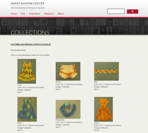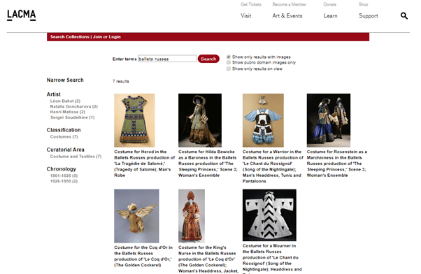 The McNay in San Antonio holds an impressive Theatre Art Collection, most of which is searchable through this page. Below you can see the search results by searching for ‘Ballets Russes Costume’ and then further refining this to just costume items.