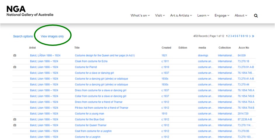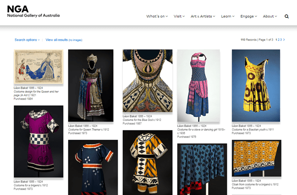 The NGA holds one of the largest collection of Ballets Russes costumes in the world. The collection is searchable here. Once you have entered your search term the results will appear in a list. Here are the results for the search ‘Ballets Russes’.