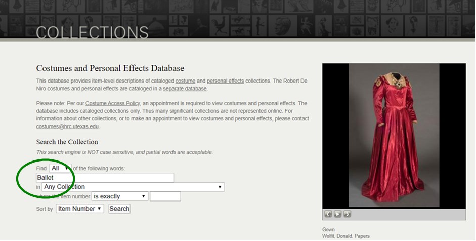 The Harry Ransom Center in Austin holds an impressive Performing Arts collection including a significant amount material relating to dance. The Costumes and Personal Effect Database is the best place to start.