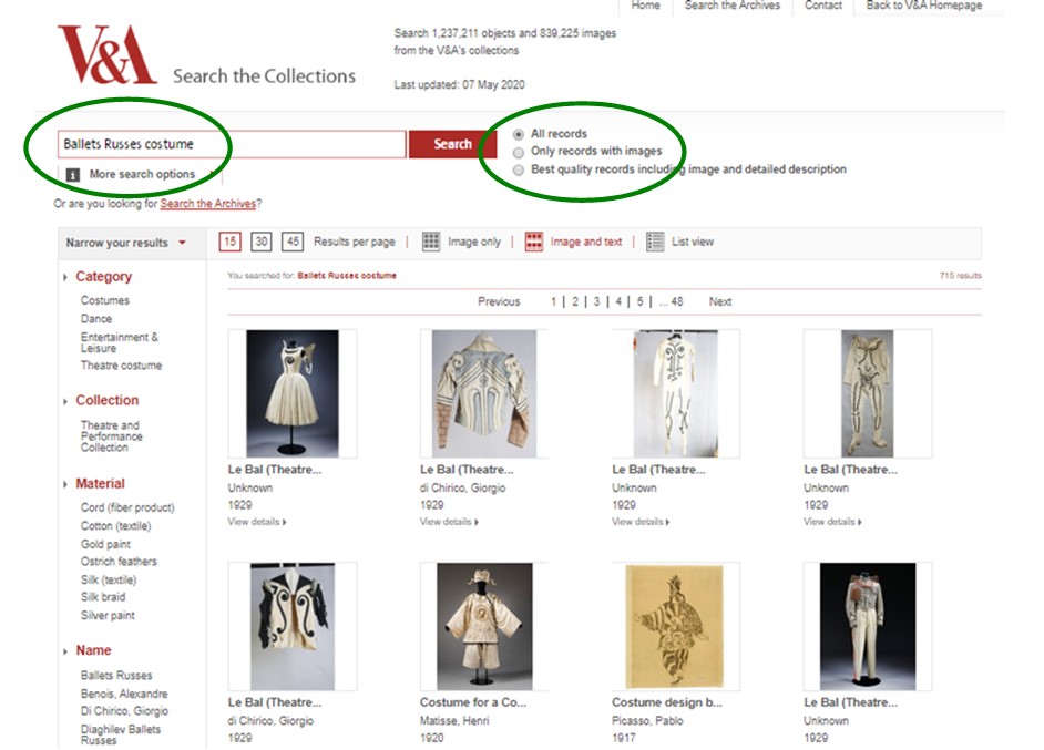 The V&A in London holds the largest collection of Ballets Russes costumes. In a similar way to the NGA, the V&A collections are searchable through a separate web-page here. For this search engine I have found you need to be a little more specific. The terms ‘Ballets Russes’ will provides 100s of items including photographs and designs, but search ‘Ballets Russes Costume’ rapidly narrows the results.