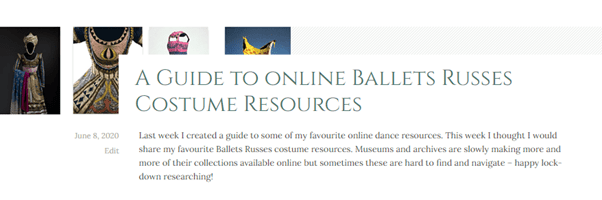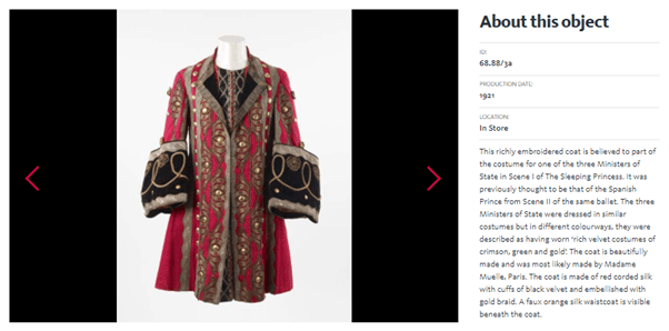 I was involved in the Museum of London’s Collections Online project where I researched and created descriptions for the majority of the Museum’s Anna Pavlova and Ballets Russes costume collections. You can see this here.